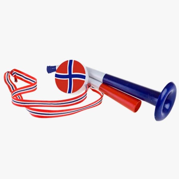 mai fløyte/horn i nasjonalfargene rødt hvitt og blått med snor.