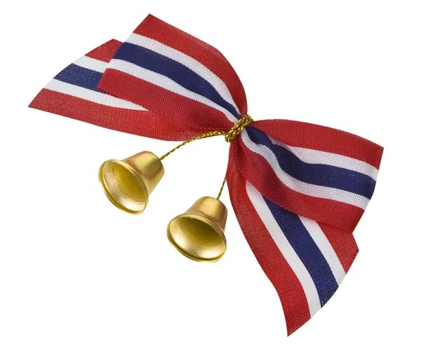 17 mai sløyfe med bjeller. Sløyfen festes enkelt på klærne. 7,6cm