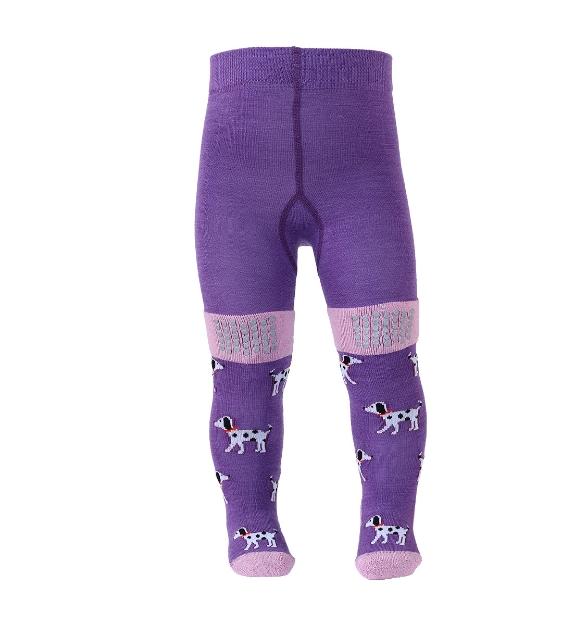 Glattstrikket ullstrømpebukse med hundemotiv til baby, med høy andel ull (92%). Strømpebuksen har antiskli-knotter på knærne og under føttene. Merinoullen føles myk og behagelig mot huden og puster godt. Den transporterer svette og fukt, og er naturlig lukthemmende.