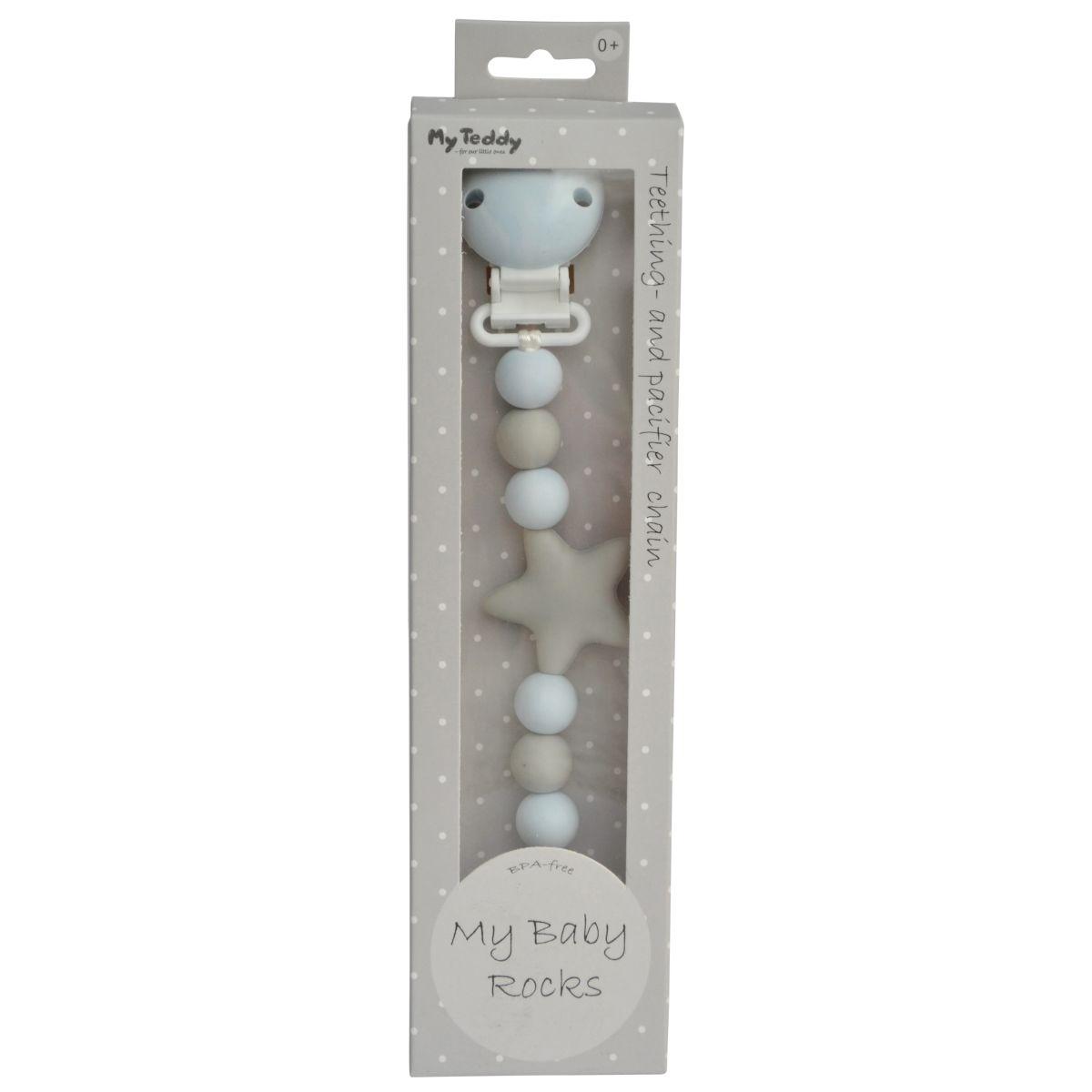 Smokkesnor fra My Teddy “My Baby Rocks” med blå detaljer og kraftig klype. Laget i myk bpa fri silikon så den er trygg for babyen!