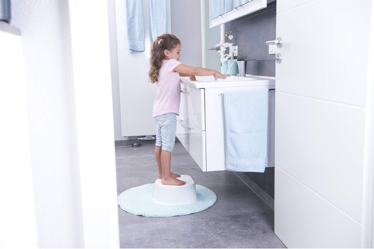 Rotho Skammel er et utmerket hjelpemiddel for å nå opp til håndfatet, toalettet, vasken, kjøkkenbenken eller lekene på hyllen. Er en enkel og stabil skammel med anti-skli under bunnen. Den “ruglete” toppen sørger for at barnet ikke sklir.