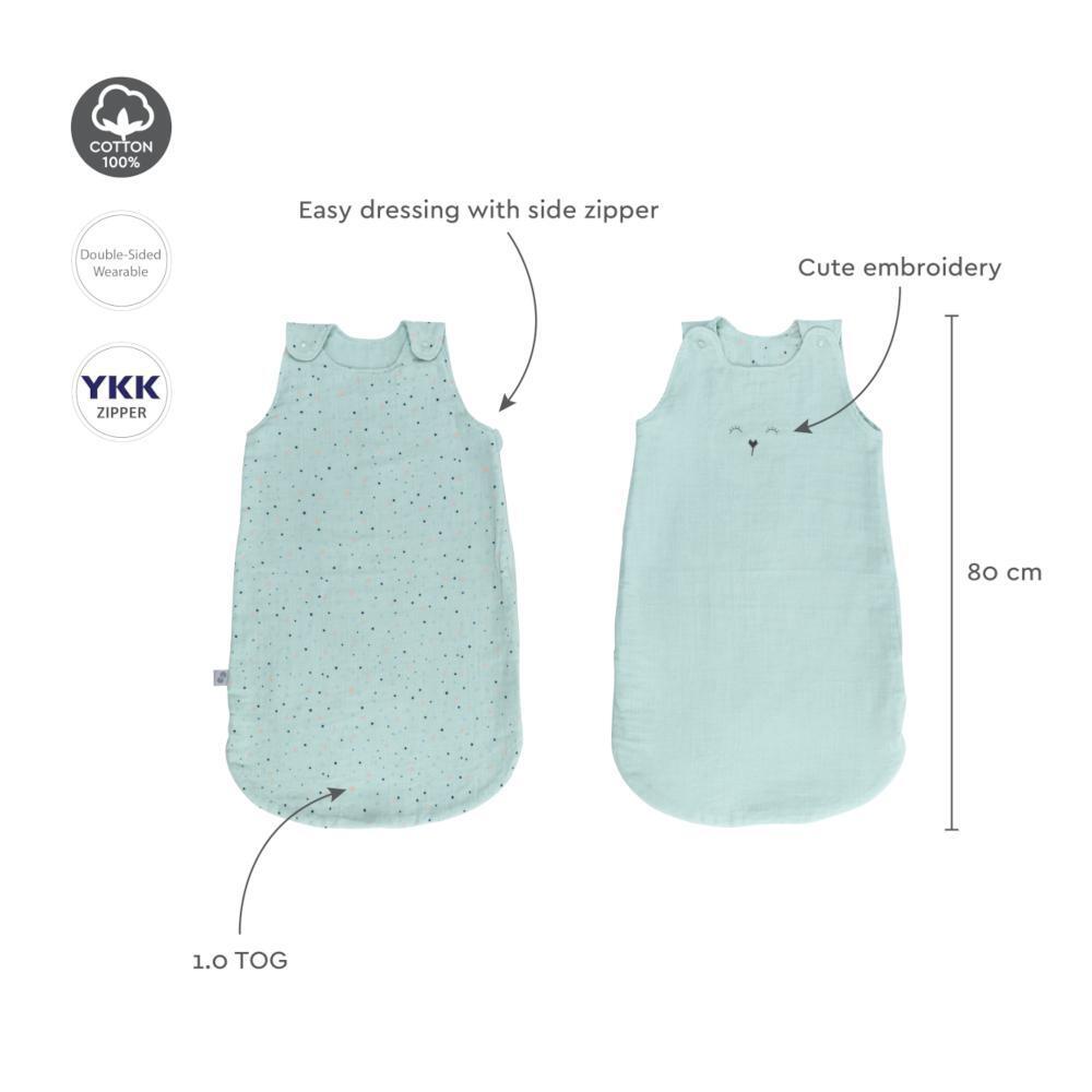 1.0 TOG babysoveposen med dobbelt lag bomullsstoff er ideell for vår-sommersesongen. Soveposen er dobbeltsidig, trykt på utsiden og heldekkende på innsiden. I tillegg har posen en glidelås fra siden til midten av bunnen, noe som gjør det enkelt å ta på seg. Soveposer regnes som et tryggere alternativ til tradisjonelle tepper.