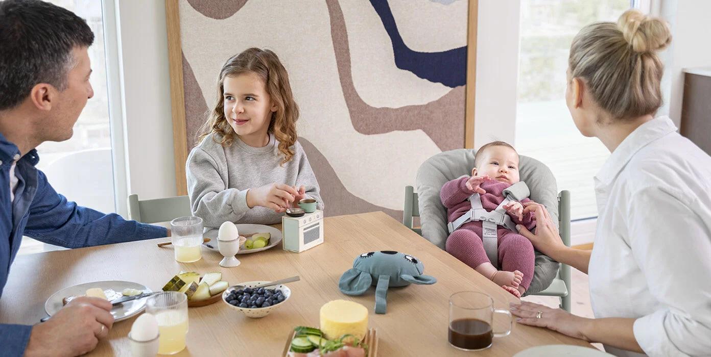 Det er komfortabelt og ergonomisk, holder barnet og løfter det til bordhøyde. Det er nå regulerbart i 2 posisjoner med glimrende støtte for bena, og danner et koselig lite rede for barnet. Dette muliggjør øyekontakt og kommunikasjon under måltider og når familien samler seg rundt bordet. Dermed kan dere holde barnet nær dere og samtidig knytte tettere bånd til hele familien.