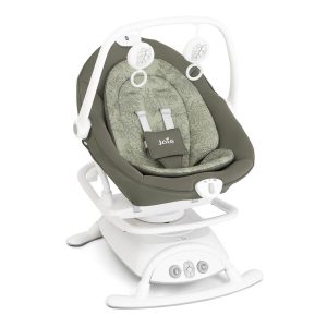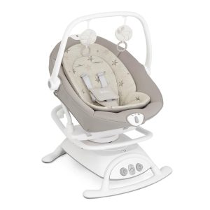 Den mykt polstrede vippestolen har en unik vuggebevegelse som etterligner følelsen av å bli vugget i mors armer. Nyfødtputen er utviklet i samarbeid med ekspert pediatrisk fysioterapeut og sikrer den nyfødte den støtten den trenger når plassert i vippestolen. Den avtagbare leketøyshengeren holder favorittleken til barnet i nærheten.
