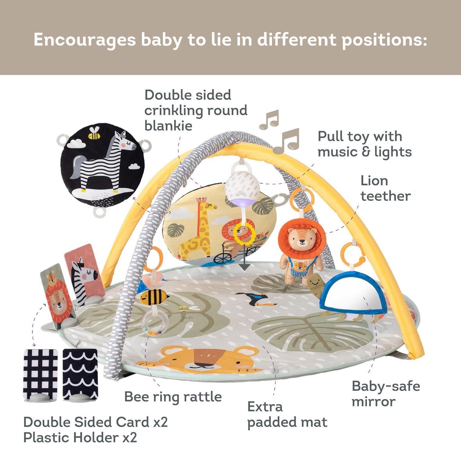 Inkluderer 7 lekne, multi-sensoriske hengende leker: krøllete, rundt teppe, skranglende løven Harry med en manebitring, 2 dobbeltsidige filtkort med 2 unike plastholdere, dobbeltsidig skilpadde med babysikkert speil, rangle for biring og en musikalsk leke med fargerike lys.