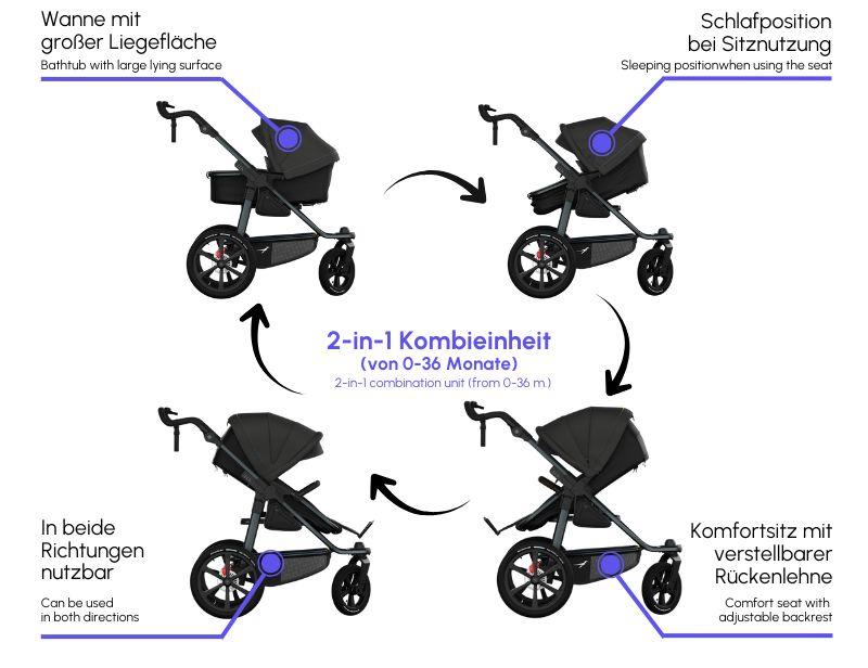 TFK Pro er utviklet spesielt for sporty foreldre som ønsker høyeste kvalitet og enestående kjøreegenskaper. Den nye løpsoptimaliserte designen gir deg den ultimate sportsvognen, som kombinerer stil og komfort. Med 16″ bakhjul og 12″ forhjul, justerbar rettlinjestabilitet og en lett aluminiumsramme, sikrer TFK Pro deg en stabil kjøretur!