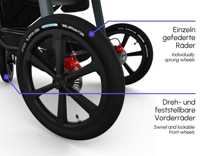 TFK Pro er utviklet spesielt for sporty foreldre som ønsker høyeste kvalitet og enestående kjøreegenskaper. Den nye løpsoptimaliserte designen gir deg den ultimate sportsvognen, som kombinerer stil og komfort. Med 16″ bakhjul og 12″ forhjul, justerbar rettlinjestabilitet og en lett aluminiumsramme, sikrer TFK Pro deg en stabil kjøretur!